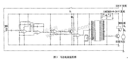 圖3中,繼電器的K1和K3為常閉狀態,閉合S1后,馬達開始工作,產生一個工作電流,使電流傳感器的感應磁頭中的MR1和MR2的阻值相應變化,從而產生一個正弦電壓信號;此時的信號往往很弱,不足以驅動繼電器,于是經過兩級放大,變成峰值較大的正弦信號;再經過比較器比較,適當調節比較器的門限電壓,令其輸出為低電平,通過單片機的編程,使之最后輸出為低電平,此時繼電器維持常閉狀態,即馬達正常工作。當馬達突然停轉,電流遠大于正常工作的電流,此時的電流信號被MRCS感應,產生的交變電壓信號經過兩級放大后,產生一個峰值為1.6~2.4 V的正弦信號,再經過比較器比較,產生一個方波信號,進入單片機,輸出高電平,驅動繼電器,讓K1和K2閉合并使得K1和K3開路便使馬達斷電,從而達到保護馬達的作用。單片機的作用是一旦發現有方波輸入就輸出高電平,無方波輸入時輸出低電平,此外,還可以對單片機編程,產生適當延時,就是當馬達停轉時,延時一小段時間才輸出高電平,以防止馬達假死。本實驗采用的單片機是ATMEL公司的AT89S52,其優點是價格便宜、供貨充足、支持ISP并口編程,使用方便。