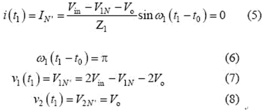 當(dāng)串聯(lián)諧振電流為0(即t1 時(shí)刻)時(shí),該模式結(jié)束,可得到如下表達(dá)式:
