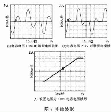 根據(jù)上面所設(shè)計(jì)的諧振參數(shù)進(jìn)行了實(shí)驗(yàn),實(shí)驗(yàn)波形如圖7 所示??梢钥闯觯瑸楸3殖潆婋娏骱愣?,隨著輸出電壓的升高,開關(guān)頻率變高,實(shí)測充電電壓為23kV 時(shí)變換器效率為92.7%。實(shí)驗(yàn)表明,所設(shè)計(jì)的諧振參數(shù)完全滿足設(shè)計(jì)要求,該裝置已用于神光III 能源系統(tǒng)。