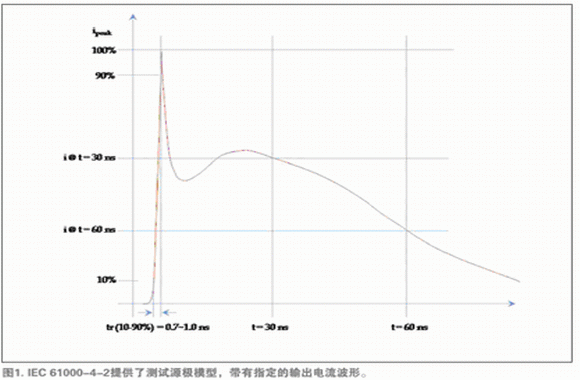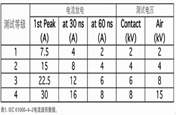 目前最常用的ESD抗擾度標(biāo)準(zhǔn)是IEC 61000-4-2標(biāo)準(zhǔn)。該系統(tǒng)級標(biāo)準(zhǔn)規(guī)定了一個(gè)源極模型,后者包含一個(gè)150pF電荷存儲器(在330 ohm源極電阻后面)和一個(gè)特定的電流放電波形(圖1和表1)。與舊標(biāo)準(zhǔn)規(guī)定的源極相比,大電荷存儲器和低源極電阻使源極模型能交付更多能量和更大電流。