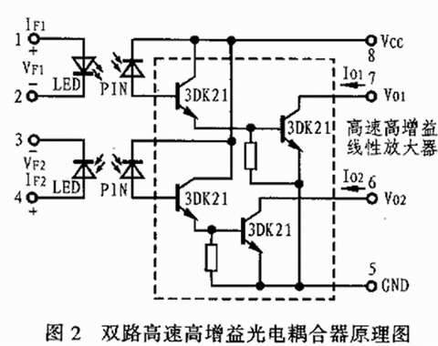 近幾年來(lái),國(guó)內(nèi)有關(guān)單位投入大量人力物力也研究和開(kāi)發(fā)了各種光電耦合器件。如上海半導(dǎo)體器件八廠、上海無(wú)線電十七廠等。而重慶光電技術(shù)研究所為了適應(yīng)市場(chǎng)需要研制出了一種由高速響應(yīng)發(fā)光器件和邏輯輸出型光接收放大器組成的厚膜集成雙路高速高增益電耦合器。這種光電耦合器的輸入端由兩只GaAIAs側(cè)面發(fā)光管組成,其輸出端由兩只Si—PIN光電探測(cè)器以及兩個(gè)高速高增益線性放大電路組成。圖2所示為其原理電路圖,除此之外,重慶光電技術(shù)研究所還研制出了高速高壓光電耦合器、GG2150I型射頻信號(hào)光電耦合器、GG2060I型高壓脈沖測(cè)量光電耦合器、GH1204U型高壓光傳輸光電耦合器以及 GH1201Y型和GOHQ-I型光電耦合器等。