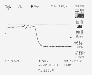 3、當(dāng)測(cè)試電容為(Ta)鉭電解電容器CT=220μF ESR=73mΩ時(shí),輸出電壓下跌值為172mV。