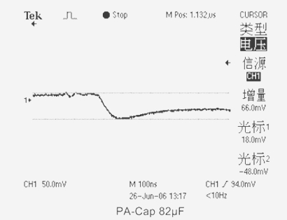5、當(dāng)測(cè)試電容采用(PA-Cap)聚合物片式疊層鋁電解電容器CT=82μF ESR=13mΩ時(shí),輸出電壓下跌值僅為66mV。