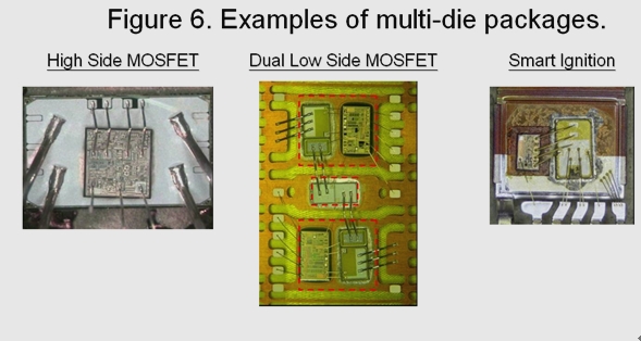 圖6所示為目前車載系統(tǒng)中采用多芯片封裝的幾個實(shí)例。這些智能化器件可以提供更高的系統(tǒng)性能監(jiān)控能力,通過集成保護(hù)功能提高功率系統(tǒng)的可靠性。如過流、過壓和過熱保護(hù)等功能都是這類產(chǎn)品的標(biāo)配。當(dāng)器件感測到有可能發(fā)生上述異常狀況時,能夠把功率MOSFET置于自我保護(hù)整個系統(tǒng)的環(huán)境中。此外,這些器件還集成有附加診斷功能,用以監(jiān)控負(fù)載開路或短路,有助于指導(dǎo)汽車機(jī)械裝置隔離和糾正車輛中出現(xiàn)的問題。