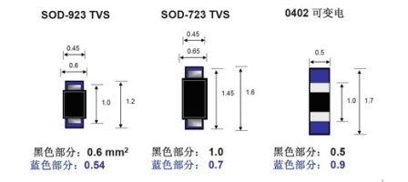 圖7 TVS元件與0402封裝可變電阻尺寸比較,藍色為建議焊接面積 (資料來源:安森美半導體)