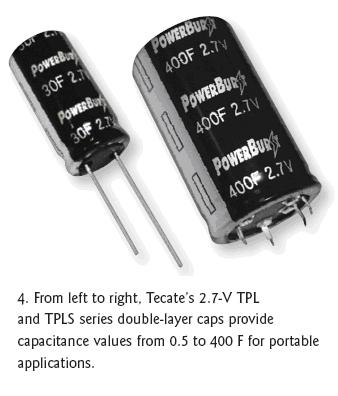 TecateGroup推出了具有多樣配置的多種PowerBurst品牌超級電容器。針對通用的脈沖電源、混合電池和便攜式產品應用,徑向引線的TPL和徑向折彎的TPLS系列雙層電容器分別具有0.5F到70F和100F到400F的容量(圖4)。這兩類器件的電壓額定值都是2.7V,工作溫度范圍是-40℃到65℃。TPL和TPLS系列的最大高度分別是45mm(100F)和60mm(400F)。