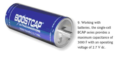 MaxwellTechnologies公司還有許多大型的具有很高容量的BOOSTCAP品牌單節電容器,不過工作電壓比較低。BCAP系列共5節,在2.7Vdc的工作電壓下電容值可達650、1200、11500、2000和3000F(圖9)。這些電容的主要用途是與電池并行工作,適合要求恒定低功率放電以及峰值負載下提供脈沖功率的應用。