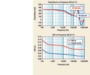 鏡像結(jié)構(gòu)如果使用更薄的陽(yáng)極,電容將隨頻率下降至更低。鏡像設(shè)計(jì)的共振頻率改變,其原因是目前一般的DC/DC轉(zhuǎn)換器其開關(guān)頻率的工作范圍(250~500kH)會(huì)因降低ESL而顯著升高。