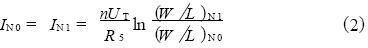 由圖3 可見, P0 和P1 組成電流鏡, 取相同的寬長比, 則。在P1、P0、N0、N1 和R5 構(gòu)成的自偏置電路中, 選擇合適的R5 值, 可以使N0 和N1工作在亞閾值區(qū)。并且, 在時, 亞閾值MOS 管的漏電流Id 可表示為: