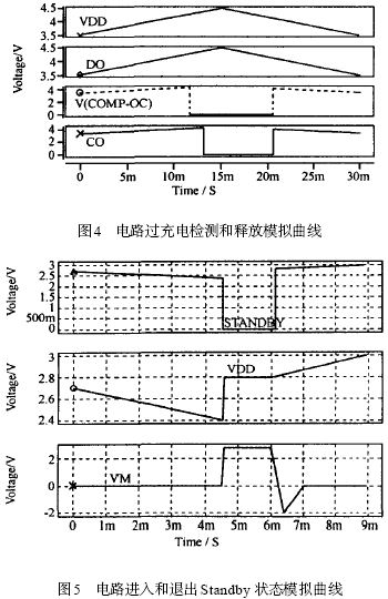 電路采用UMC 0. 6 μm 數(shù)字電路SPICE 模型進行HSPICE 模擬驗證。圖4 給出了電路對電池電壓VDD 進入和退出過充電狀態(tài)時的模擬結(jié)果, 從圖中可看出, 過充電出現(xiàn)后, CO 端被置為低電平, 反之則是與電源電壓相等的高電平。