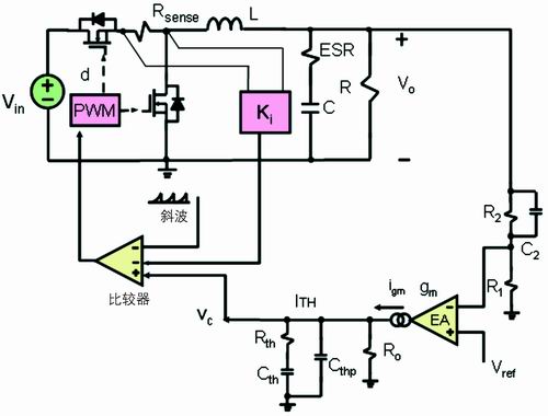 通過前面的討論可知,在每個開關周期,低端的開關管流過的電流波形為下降階段的梯形波。這種電流模式常稱為谷點電流模式。和峰值電流模式一樣,谷點電流模式反饋也有兩個環路:一個電壓外環,另一個是電流內環(見圖2)。