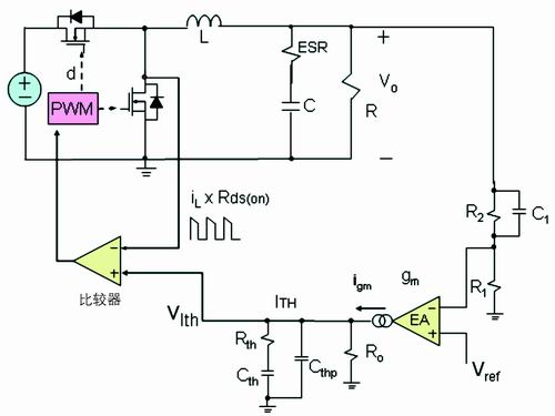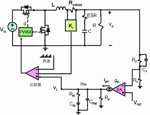 電流取樣電阻在輸入端的降壓轉換器如圖1所示。在電流模式的降壓轉換器拓樸結構中,反饋有兩個環路:一個電壓外環,另一個是電流內環。電壓外環包括電壓誤差放大器、反饋電阻分壓器和反饋補償環節。電壓誤差放大器的同相端接一個參考電壓Vref,反饋電阻分壓器連接到電壓誤差放大器反相端VFB,反饋環節連接到VFB和電壓誤差放大器的輸出端VC。若電壓型放大器是跨導型放大器,則反饋環節連接到電壓誤差放大器的輸出端VITH和地。目前,在高頻DC/DC的應用中,跨導型放大器應用更多。本文就以跨導型放大器進行討論。輸出電壓微小的變化反映到VFB引腳,VFB引腳電壓與參考電壓的差值被跨導型放大器放大,然后輸出,輸出值為VITH??鐚头糯笃鬏敵鲞B接到電流比較器的同相端,電流比較器的反相端輸入信號為電流檢測電阻的電壓信號VSENSE。由此可見,對于電流比較器,電壓外環的輸出信號作為電流內環的給定信號。對于峰值電流模式,工作原理如下:在時鐘同步信號到來時,高端的主開關管開通,電感激磁,電流線性上升,電流檢測電阻的電壓信號也線性上升。由于此時電壓外環的輸出電壓信號高于電流檢測電阻的電壓,電流比較器輸出為高電壓;當電流檢測電阻的電壓信號繼續上升,直到等于電壓外環的輸出電壓信號時,電流比較器輸出翻轉,從高電平翻轉為低電平,邏輯控制電路工作,關斷高端主開關管的驅動信號,高端的主開關管關斷,此時電感開始去磁,電流線性下降,到下一個開關周期開始的時鐘同步信號到來,如此反復。