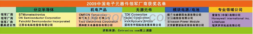 2009中國市場電子元器件領軍廠商評選活動隆重亮相,在社區網友的積極參與下,經過激烈的網上投票和打分,令人翹首期盼的獲獎名單終于震撼登場,共有16家中外企業最終獲得“2009中國市場電子元器件領軍廠商”稱號,另有五家本土企業分獲“2009中國市場電子元器件最具成長性公司”稱號。
