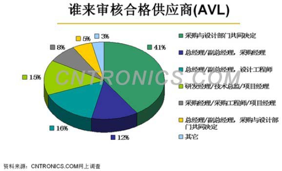 誰能審核和最終決定合格供應商名單呢?這是電子元器件制造商和分銷商最為關心的問題,從調查數據中可以看出,決策權并不限于某一個部門。趨于四成的公司審核和決定合格供應商名單(AVL)是由采購與設計部門共同決定,由采購部門單獨決策的不足一成;而由研發部門單獨決策的僅為15%,由此可見,在電子產品開發速度加快和上市時間日趨壓縮的背景下,電子行業的采購與研發的合作關系日趨緊密,采購部門更多的參與到產品開發的過程中,在提供成本預測、確定替代供貨源和降低成本方面扮演著重要角色。此外,通過調查還發現,多個部門共同決定元器件采購,已經成為業界采購流程的發展趨勢。除研發和采購部門外,公司總經理等決策高層也更多的關注和參與到電子元器件采購中。