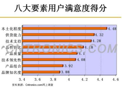 從柱狀圖可以看出,性價比、技術支持和供貨能力普遍得分很高。而產品組合和品牌知名度普遍得分較低。由此可見,在金融危機影響依然持續的情況下電子整機廠商更加重視電子元器件的供貨能力和技術支持能力。[page]