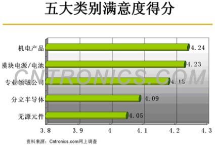 在五大類別的用戶滿意度調查中,回復者對機電類產品和模塊電源/電池類公司滿意度較高,而對無源元件和分立半導體公司滿意度最低,電子元件技術網調查分析發現: