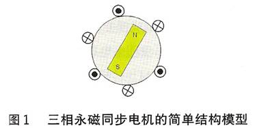 三相混合式步進電機的工作原理十分類似于永磁同步伺服電機。其轉子上所用永磁磁鐵同樣是具有高磁密特性的稀土永磁材料,所以在轉子上產生的感應電流對轉子磁場的影響可忽略不計。在結構上,它相當于一種多極對數的交流永磁同步電機。由于輸入是三相正弦電流,因此產生的空間磁場呈圓形分布,而且可以用永磁式同步電機的結構模型(見圖1)分析三相混合式步進電機的轉矩特性。為便于分析,可做如下假設: