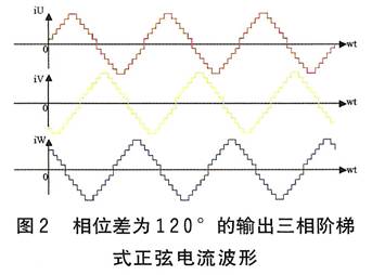 以上分析表明,對于三相永磁同步電機,當三相繞組輸入三相對稱的正弦電流時,由于在內部產生圓形旋轉磁場,電機的輸出轉矩為恒值。因此,將交流伺服控制原理應用到三相混合式步進電機驅動系統中,輸入的220V交流,經整流后變為直流,再經脈寬調制技術變為三路階梯式正弦波形電流(見圖2),它們按固定時序分別流過三路繞組,其每個階梯對應電機轉動一步。