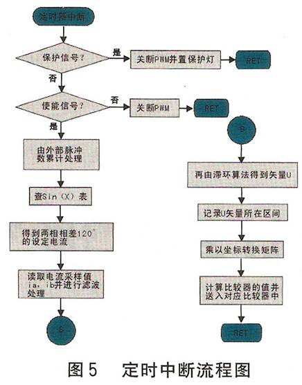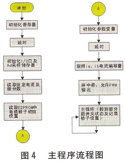 圖4示出主程序流程圖,圖5示出定時中斷流程圖。為減少功耗和保護電機,設置了自動半電流功能(靜態鎖軸或沒有脈沖輸入時電流減半),它由滯環比較器自動進行調節。