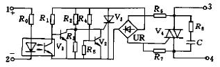 過零觸發型AC—SSR為四端器件,其內部電路如圖1所示。1、2為輸入端,3、4為輸出端。R0為限流電阻,光耦合器將輸入與輸出電路在電氣上隔離開,V1構成反相器,R4、R5、V2和晶閘管V3組成過零檢測電路,UR為雙向整流橋,由V3和UR用以獲得使雙向晶閘管V4開啟的雙向觸發脈沖,R3、R7為分流電阻,分別用來保護V3和V4,R8和C組成浪涌吸收網絡,以吸收電源中帶有的尖峰電壓或浪涌電流,防止對開關電路產生沖擊或干擾。