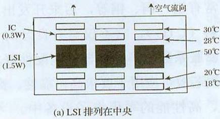 熱性能相同發熱元器件布置:圖5顯示PCB上安裝IC(0.3W),LSI(1.5W)時溫度上升的實測值。按圖5(a)排列,IC的溫度上升值是18℃-30℃,LSI溫度上升值是50℃。按圖5(b)排列,LSI溫度上升值是40℃,比圖5(a)排列還要低10℃。