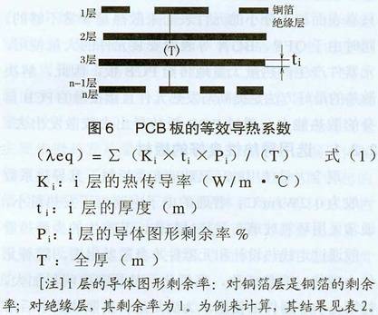 評價PCB的散熱能力,就需要對由導熱系數不同的各種材料構成的復合材料一一PCB用絕緣基板的等效導熱系數(九eq)進行計算。PCB板的等效導熱系數見圖6所示。
