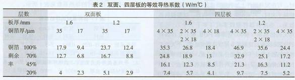 從表2我們可以看出板厚度越小,銅箔越厚,銅箔剩余率越高,層數越多,其等效導熱系數越大,PCB板的導(散)熱效果越好。