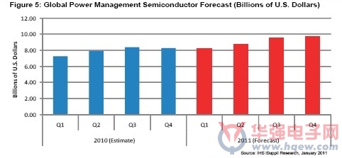 2011 年推動全球電源管理半導體銷售額繼續增長的因素,包括產業尋求進一步提高電池驅動設備的效率。全球各地的消費者都希望手機、平板電腦、筆記本電腦和便攜導航設備等移動設備的電池具有更長的壽命,可能促使電源管理IC領域出現新的設計趨勢,從而提供供應商的營業收入。