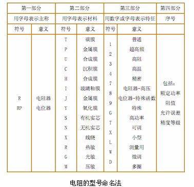 在電子電路中常用的電阻有固定式電阻和電位器,根據(jù)SJ-73標準規(guī)定,電阻器、電位器的命名由四部分組成:第一部分主稱,第二部分材料,第三部分分類特征,第四部分序號(不適用敏感電阻)。