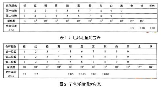 現(xiàn)在常用的固定電阻都用色環(huán)法來表示它的標稱阻值和誤差。色環(huán)法就是用顏色表示元件的標稱阻值和誤差,并直接標志在產(chǎn)品上的一種方法。常見的色環(huán)電阻有四環(huán)和五環(huán)電阻兩種(其中五環(huán)電阻屬于精密電阻)。一般由四道色環(huán)或五道色環(huán)來表示其標稱阻值和誤差,各種顏色代表不同的數(shù)值,色環(huán)顏色所代表的數(shù)字或意義如表1和表2所示。