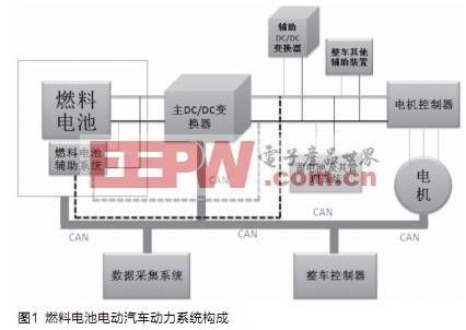 目前,燃料電池電動汽車(FCEV)成為我國汽車科技創(chuàng)新主攻方向。燃料電池電動汽車動力系統(tǒng)主要由燃料電池發(fā)動機,DC/DC變換器,蓄電池,電機控制器(變頻器)及電機,整車控制器,數(shù)據(jù)采集系統(tǒng)及CAN總線組成,如圖1所示。其中DC/DC變換器可以對燃料電池的輸出進行控制及能量的傳遞與轉(zhuǎn)換,成為燃料電池電動汽車關鍵零部件之一。在燃料電池電動汽車運行過程中,DC/DC變換器所處的電磁環(huán)境十分復雜,各種形式的電磁干擾很多,嚴重影響了DC/DC變換器的正常運行。因此,研究FCEV用DC/DC變換器的電磁兼容性對DC/DC變換器乃至燃料電池電動汽車的可靠運行具有重要意義。