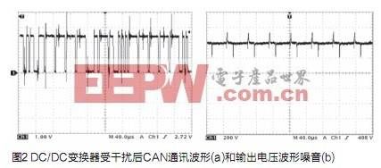 FCEV用DC/DC變換器的功率一般比較大,通常選擇IGBT為功率開關管。功率開關管IGBT工作過程中產(chǎn)生高的du/dt和di/dt以及浪涌電流和尖峰電壓[1],這是FCEV用大功率DC/DC變換器產(chǎn)生電磁干擾最根本的原因。另外功率開關管開通和關斷瞬間,由于分布電感和分布電容的存在,電感電流容易發(fā)生高頻振蕩,這些因素都會產(chǎn)生強大的電磁干擾,這在FCEV用大功率DC/DC變換器中表現(xiàn)的尤為明顯。這種電磁干擾嚴重影響整車控制器與CAN通信,導致CAN通訊頻繁報錯,無法正常通訊。CAN通訊受干擾后的傳輸波形如圖2(a)所示。從圖中可以明顯看到,變換器開關噪音疊加在CAN通訊脈沖上,并且幅度很大。此外,嚴重的電磁干擾也會使大功率DC/DC變換器輸出紋波過大,紋波過大直接影響大功率DC/DC變換器的性能[2]。圖2(b)是用示波器采集到的變換器未經(jīng)濾波處理的輸出電壓波形,從圖中可以看到,輸出電壓上疊加了大量的開關噪音。