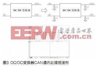 FCEV用大功率DC/DC變換器產(chǎn)生的電磁干擾以傳導干擾為主。目前最常用的方法就是在DC/DC變換器輸入和輸出端加裝濾波電容器。如圖3,為了減小FCEV用大功率DC/DC變換器對CAN通訊的干擾,在變換器輸入輸出端加適量的接地電容,CAN通訊波形得到有效改善。