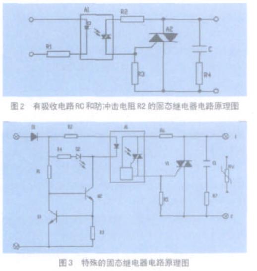 圖1、圖2 和圖3 三種電路都能實現(xiàn)固態(tài)繼電器的功能。圖1 是固態(tài)繼電器最簡單的電路原理圖,圖中A1 是交流光耦,A 2 是雙向可控硅。常用在小型的S S R ,使用時,用戶往往在外面增加器件來改善性能。圖2 是在圖1 的基礎(chǔ)上增加了RC 吸收電路和防沖擊電阻R2 。R 2是保護光耦,抑制在導(dǎo)通瞬間流過光耦的沖擊電流。附加這些器件后,大大改善了SSR 的EMC 特性和浪涌對光耦的沖擊性能。因此該電路常用在可靠性較高的場合。圖3 是一種特殊的電路,常用在高可靠性和E M C 等級較高的SSR 設(shè)計中。圖中的二極管D1 可防止輸入反極性。由Q1、Q2、R1 及R3 組成恒流電路,保證當(dāng)輸入電壓變化時,光耦A(yù) 1 的電流恒定。R C 電路C 1 、R 7 和R 6 的功能與圖2 的相同。該電路還增加了壓敏電阻R V 。R V不僅加強了S S R 的過壓保護能力,而且大大改善了其E M C 性能。