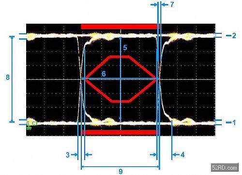 通過在示波器的垂直軸對數(shù)字信號進行反復(fù)采樣、同時采用相應(yīng)數(shù)據(jù)率對水平時間掃描進行觸發(fā)來生成眼圖。所獲得的圖形看上去象眼睛,如圖1所示。“眼睛”越大,數(shù)據(jù)完整性越高。通常采用模板(mask)來對可接受的信號質(zhì)量進行定義。這模板由“眼睛”中間的六角形和“眼睛”上、下的矩陣組成。如果測得的信號跡線穿越模板的邊線,那么信號質(zhì)量就不可接受。USB2.0信號模板規(guī)范由USB應(yīng)用者論壇(USBIF,www.usb.org)提供,可參見USB2.0版規(guī)范第7.1.2.2章節(jié)。圖1中顯示了帶有詳細(xì)臨界點的眼圖。