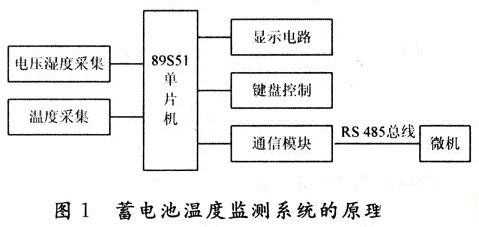 蓄電池溫度監(jiān)測系統(tǒng)的原理框圖如圖1所示。主要由電壓、溫濕度采集、溫度采集、89S51單片機、鍵盤控制模塊、顯示電路模塊、通信模塊組成。該系統(tǒng)能完成6組或6組以上通信電池的溫度測量、1路機房環(huán)境測量(溫度、濕度測量)、2路直流電壓和2路交流電壓測量,傳輸數據距離大于200m。