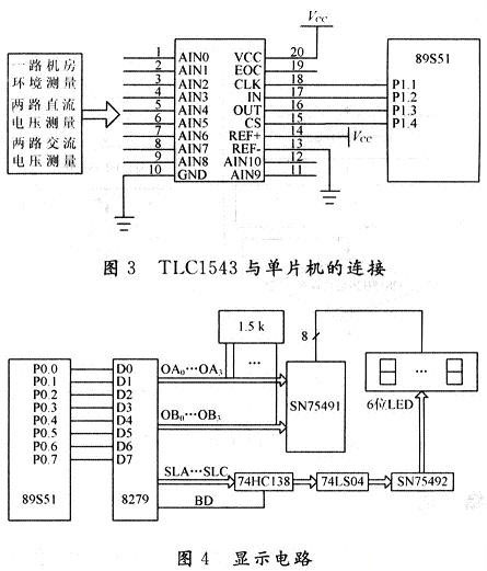 直流電壓、交流電壓以及機房溫濕度的測量選用TLC1543,TLC1543為10位11通道的A/D轉換器,與單片機的連接如圖3所示。機房環(huán)境測量(溫度、濕度)采用JWS溫濕度變送器,輸出信號為標準0~5V直流電壓信號;直流電壓的數據采集經電阻分壓后直接送至A/D轉換器,交流電壓的采集經分壓整流后也直接送至A/D轉換器。