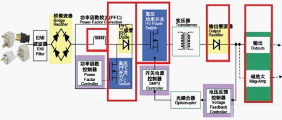在一個電源設計中,能效規范對電路段的挑戰主要體現在PFC能效、主轉換器能效和次級能效幾個方面。要提高這幾個方面的能效,就必須改善如圖1所示電路紅色框中的元件性能。以下將介紹改善電路段能效的幾種方法。