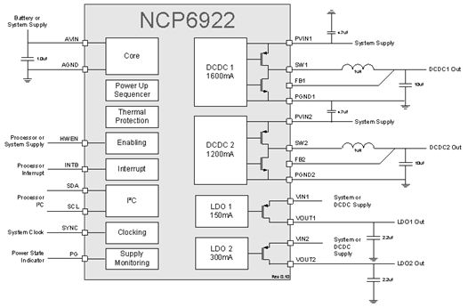 圖2:安森美半導體的NCP6922 mini-PMIC集成2路DC-DC、2路LDO及其它多種功能。