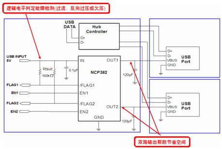 NCP382則是一款功率分配開關,其設計針對很可能會遇到大的電容性負載或短路的應用。實際上,越來越多便攜電子設備采用USB供電,但需要保護本地USB電源夠用受外部Vbus故障影響。NCP382能夠通過在輸出負載超過限流閾值或出現短路時切換至恒流模式,將輸出電流限制在期望的電平(0.5 A、1 A或1.5 A),從而提供過流保護。NCP381接收2.5 V至5.5 V的單路輸入,提供2路輸出。圖6是NCP382的典型應用電路圖。
