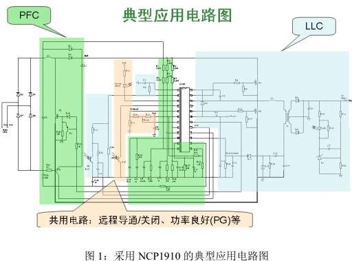 圖1是采用NCP1910的典型應用電路圖共用電路,它包括遠程PFC段、LLC段,以及實現導通/關閉、功率良好(PG)等的共用電路。