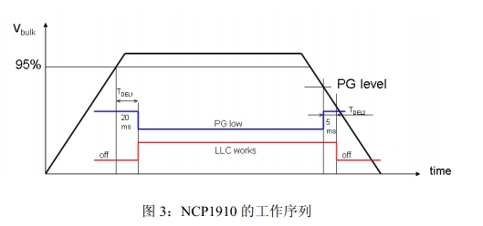 NCP1910的工作序列如圖3所示,如果PFC未就緒,LLC就不能啟動;一旦PFC就緒,就會開始一段20ms的延遲;延遲結束后PGout引腳假定為低電平,LLC可以開始工作。在撥除交流輸入關閉電源時Vbulk降低,到達PG信號時,PGout引腳被釋放(開路);如果Vbulk到達LLC停止電平,LLC停止工作;或者如果Vbulk緩慢下降,如處在輕載狀態,LLC會在PGout引腳被釋放5ms后停止工作。