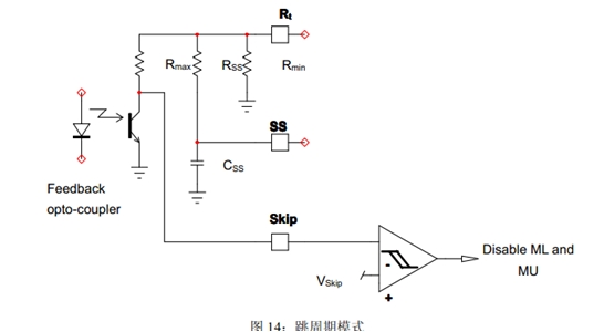 在下列情況時,VLBO可下拉至2V(VLBO(PD)):VLBO高于2V(高線路電壓時),以及VCTRL處于最大值的時間長于4ms(tPFCflag);Vbulk低于額定輸出的95%時。PFCPowerBoost功能在啟動時被禁止;最長下拉持續時間的典型值為5ms(tLBO(PDlimit));在后續最少70ms時間(tLBO(PDblank))內,開關保持在開路狀態。
