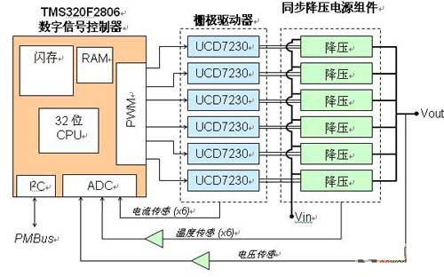 TI推出的32位TMS320F2806數字信號控制器(DSC)運行在100MHz頻率下,并且以電源應用為目標。在本例中,其在軟件中實施電壓模式控制,該軟件使用一個在PWM開關頻率上進行采樣的單通道2極點2零點數字補償器。隨后產生的占空比值將被傳給每一個降壓相(所有為實現相位平衡所作的占空比調節除外)。通過使用片上12位模數轉換器(ADC)獲得系統輸出電壓反饋。MOSFET溫度在整個ADC中均為可用,以實現監控的目的,并且片上內部集成電路(I2C)端口提供了對PMBus™通信的支持。針對同步降壓應用專門設計了一款UCD7230柵極驅動器,從而提供了采用TITrueDrive™輸出架構的雙通道4-AMOSFET驅動器、周期性電流限制以及一個內置低失調、高增益、差分電流傳感放大器。
