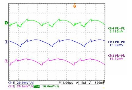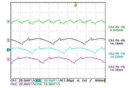 圖2a顯示了一款120°交錯式(條件:10V輸入、2V輸出、3A負載及300kHzPWM開關)PWM結構的三相交錯式降壓轉換器的示波器屏幕采集圖。示波器通道1至3顯示的是單個相位電壓,而通道4顯示的是交錯式輸出電壓(所有示波器通道均為AC耦合)。通過所有運行中的三個相位,可以得出該輸出紋波為4.9mV(輸出電壓的0.25%)。在沒有調整兩個剩余相位(見圖2b)角的情況下,切除相位2會引起輸出紋波增加86%,即為9.1mV。為了獲得180°交錯(見圖2c),對兩個剩余相位進行軟件調整以后,該紋波減少至7.9mV。在仍然比初始值大的同時(因為一個兩相位系統無法獲得如一個三相系統一樣的低紋波),其比未被調整的剩余相位角提高了13%。
