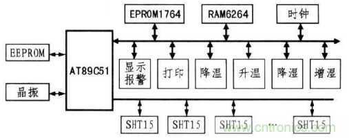 AT89C51和SHT15之間通過串行總線進行通信。執行機構主要由電機控制的降溫機、升溫機、降濕機、增濕機等組成。彈藥倉庫的溫/濕度監控系統如圖3所示。