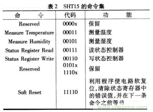 由于SHTl5中含有存儲器,所以設置初始化程序主要是對單片機和SHTl5的存儲器中的一些數據置初值,同時對單片機的初態進行初始化。該系統是多通道的測量系統.SHTl5上電后經過10ms時間就進入休眠狀態,只有當單片機發出測量命令后,SHTl5才被“喚醒”而進行工作,所以.單片機循環對各個傳感器發出溫,濕度測量命令,實現多通道的溫,濕度測量。SHTl5的命令集如表2所列。