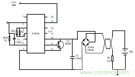 當電源電壓低于36V 時,功耗可低一些。IN4048 接成的橋式電路可以保證XTR105 的電源極性不反接,從而真正實現兩線制。C2 為去耦電容,其值是0.01μF,用于降低高頻干擾。負載RL 用于將傳送的4~20mA 的電流轉換為電壓,供后級處理。選擇負載阻抗RL,應使得輸出在4~20mA 范圍內變化時,引腳7 和引腳8 之間的電壓保持在11.6V~40V 的電源電壓范圍內。