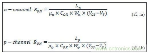 在VIN為各種電平條件下,p溝道和n溝道RON的并聯(lián)值形成并聯(lián)結(jié)構(gòu)的RON特征(圖2)。RON隨VIN的變化曲線在不考慮溫度、電源電壓和模擬輸入電壓對RON影響的情況下為直線。為使信號(hào)損耗和傳輸延遲最小,理想情況下的RON應(yīng)盡量小。然而,降低RON將增大MOSFET硅片的寬度/長度(W/L)比,從而造成較高的寄生電容和較大的硅片面積。這種較大的寄生電容降低模擬開關(guān)的帶寬。如果不考慮W和L,RON是電子和空穴遷移率(μn和μp)、氧化物電容(COX)、門限電壓(VT)及信號(hào)電壓、n溝道及p溝道MOSFET的信號(hào)電壓VGS (VIN)的復(fù)合函數(shù),如式1a和1b所示。