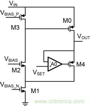 圖3:M4位于放大器反饋環路中、無輸出電容器的LDO。